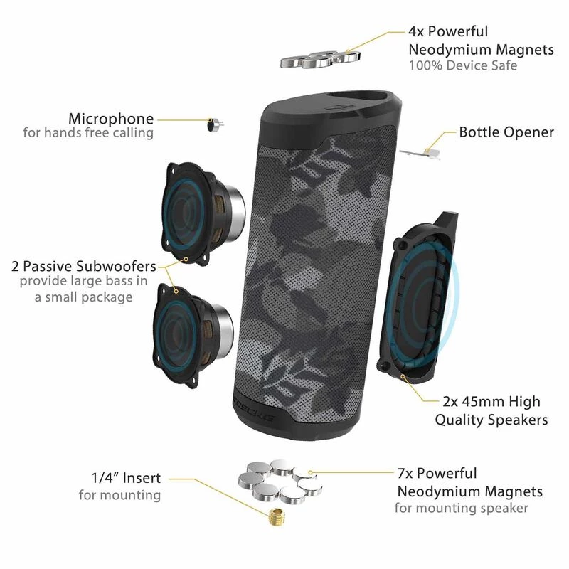 - POWERFUL PORTABLE SOUND: The Dual 45mm high quality speaker’s built-in subwoofer and audio sensing EQ provide the perfect audio experience indoors or outdoors and the rugged waterproof housing making this perfect for your action-packed adventures